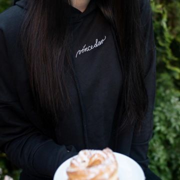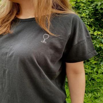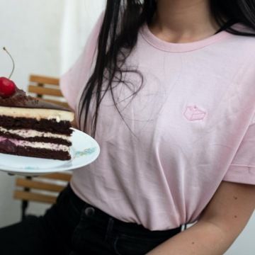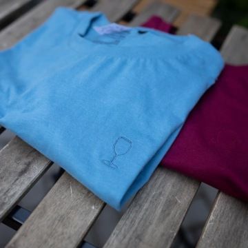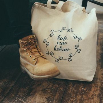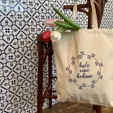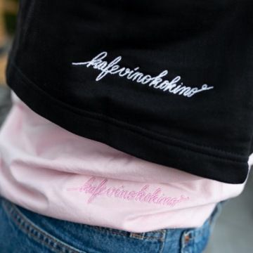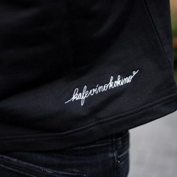 Jako u triček jsme zvolit jen minimalistickou výšivku hrnečku/skleničky či dortíku na prsou plus vyšitý nápis kafevínokokino vzadu dole na zádech. Nechybí cedulka s logem za krkem.